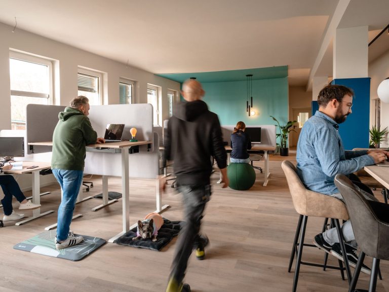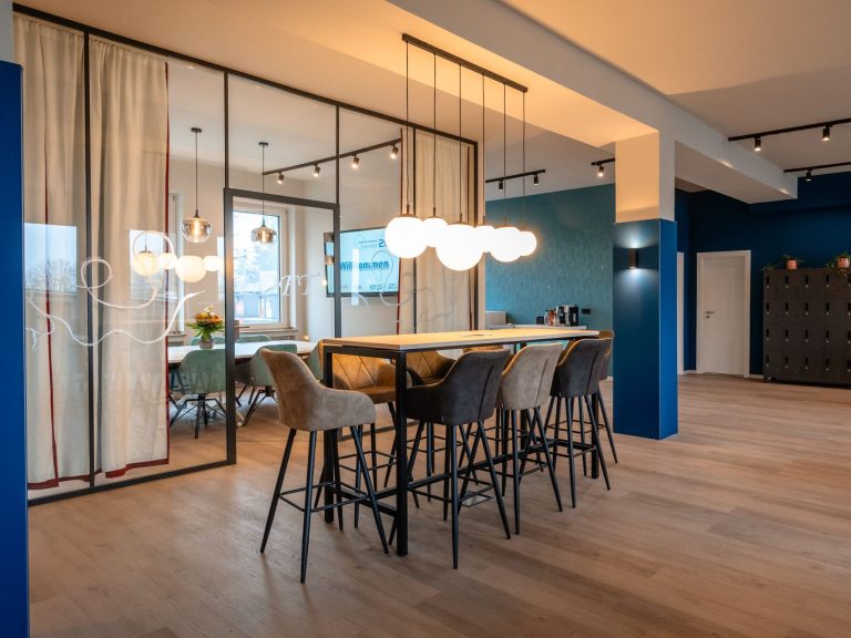 Flexible Arbeitsplätze, ein angeschlossener Meetingraum, ein gemütlicher Loungebereich und eine praktische Küchenzeile schaffen ideale Voraussetzungen für Austausch, Konzentration und kurze Pausen.